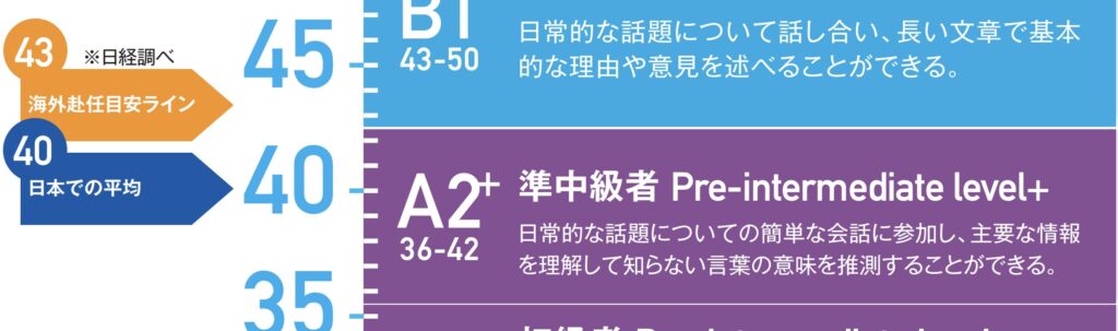 | 43〜50点 | B1 | 中級者レベル | 社内会話・ミーティングに参加できる。自分の意見や理由を伝えられる。海外赴任や出張の最低目安(43点)ライン。 |