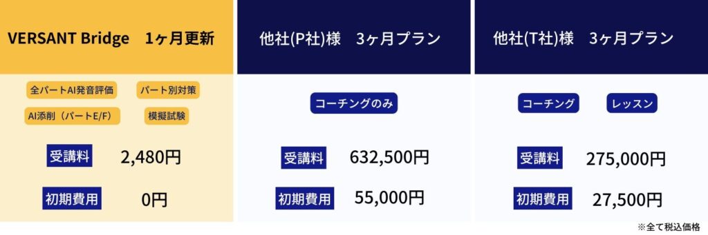 VERSANT対策という目的に限って考えると、このコスト差は無視できないポイントと言えるでしょう。