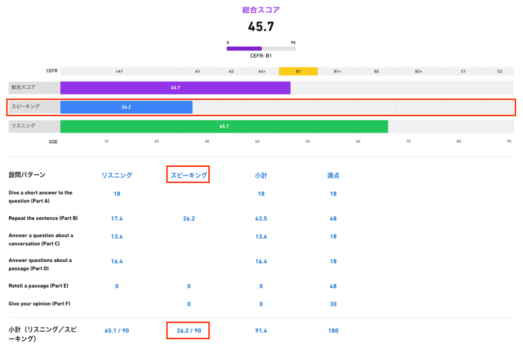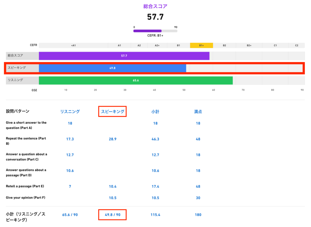 先ほどのスコアレポートでは「スピーキング」がボトルネックだったので、スピーキングが評価されるパートB/E/Fに絞って対策するのが効果的です。