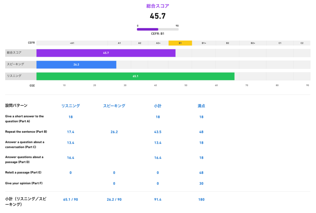 本試験のスコアレポートは、基本的に 総合+スピーキング/リスニング/話法能力 といった「スキル別」の結果が中心です。