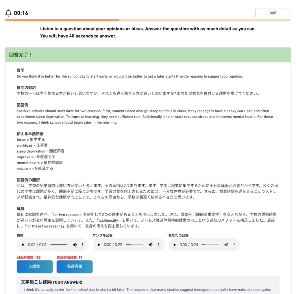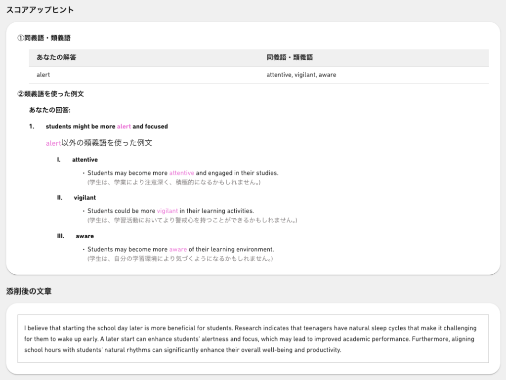 次の画像は、VERSANT対策アプリVERSANT BridgeのパートF「回答・解説画面」「AI添削画面」です。