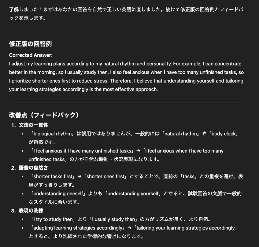 Chat GPTで自分の回答を添削してもらった場合、次のようにフィードバックをもらうことができます。