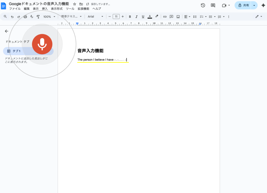 ② マイクのイラストをクリックし英語を話すと、自動的に文字起こしされます。