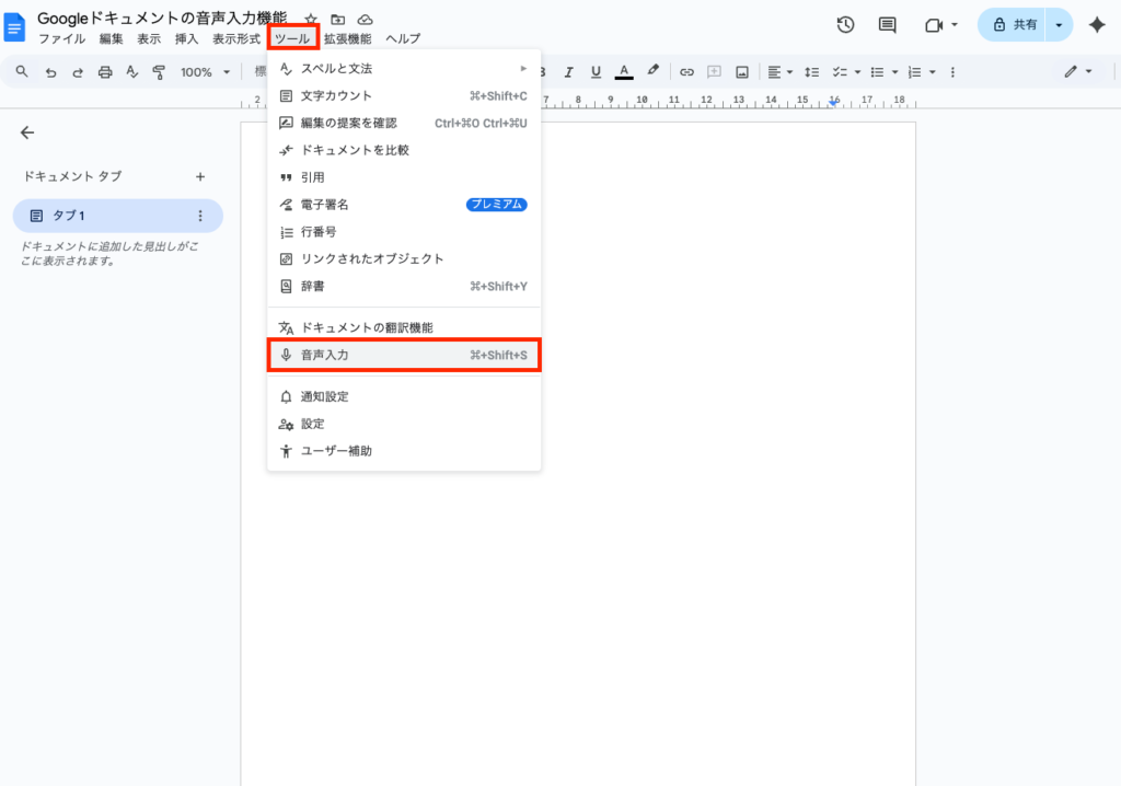 ① Googleドキュメントを開き、左上の「ツール」→「音声入力」に進みます。