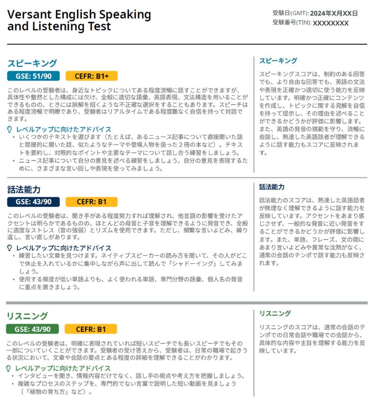 VERSANTのスコアレポートは、総合スコアだけでなく、「スピーキング」「リスニング」「話法能力」という3つのスコアを詳細に示してくれます。