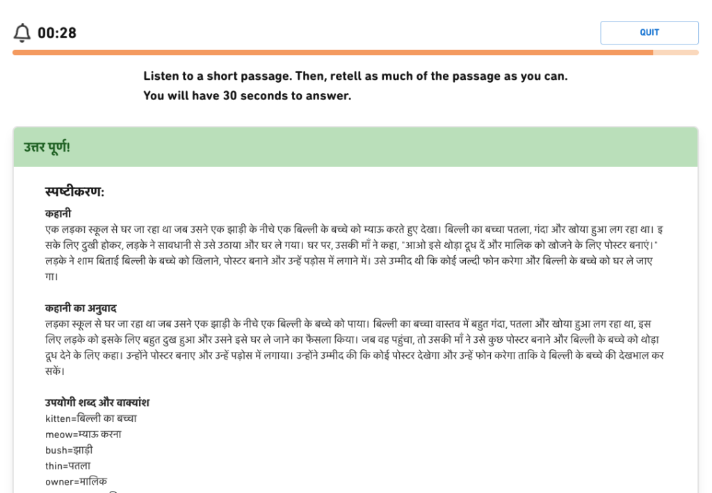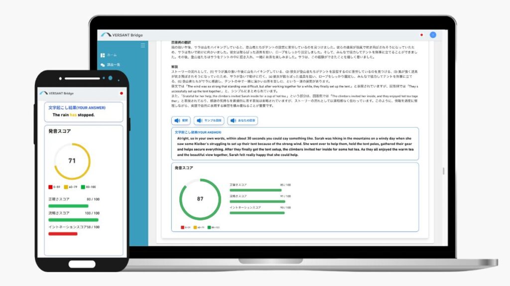 VERSANT Bridgeでは、すべてのパートで録音した音声をリアルタイムに分析し、正確さ・流暢さ・イントネーションをスコア化します。