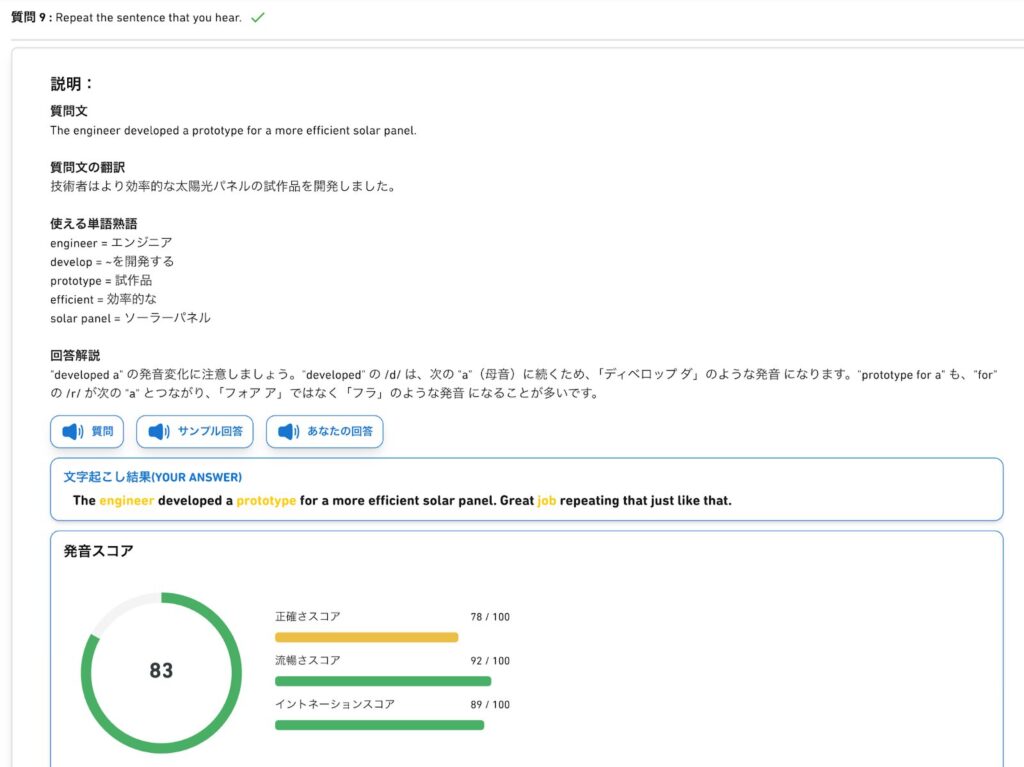回答音声はAIが自動で文字起こしと採点を行うため、その場で自分の弱点を可視化できます。