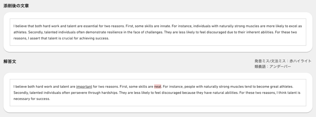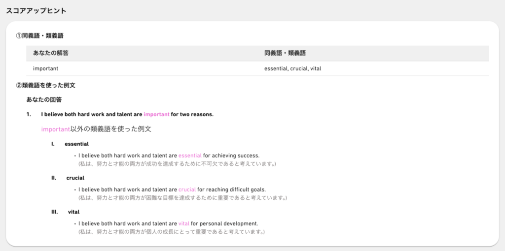 - AI添削機能(Part E・F対応):文法・語彙・構成を自動で分析