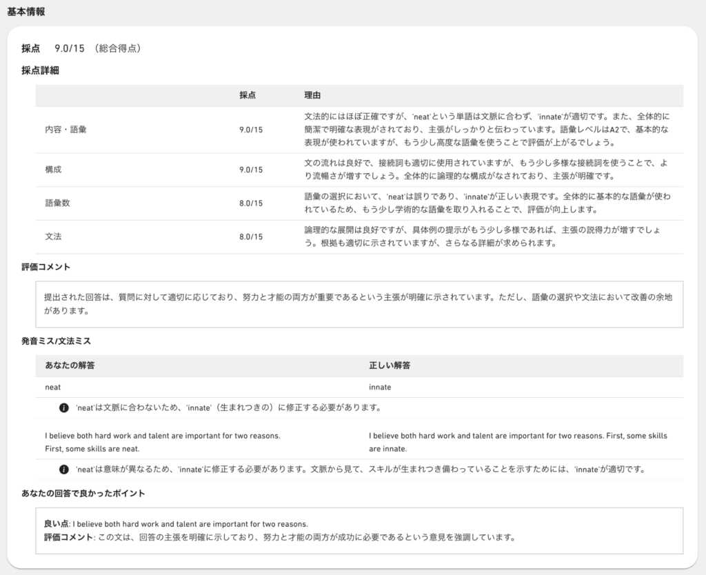 自分の回答をAIが自動で瞬時に分析し、文法・語彙・構成・内容まで細かく評価します。