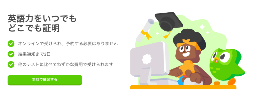 受験費用が安い、結果通知が早い、試験時間が短いという理由でDuolingo English Testはおすすめです。