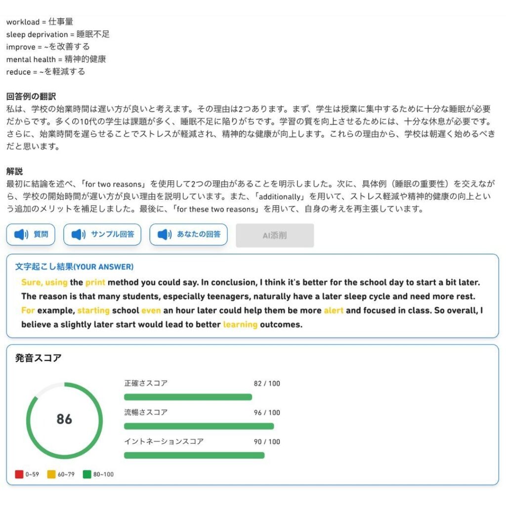 - 自分の回答音声を確認し、発音や話し方を客観的に見直せる