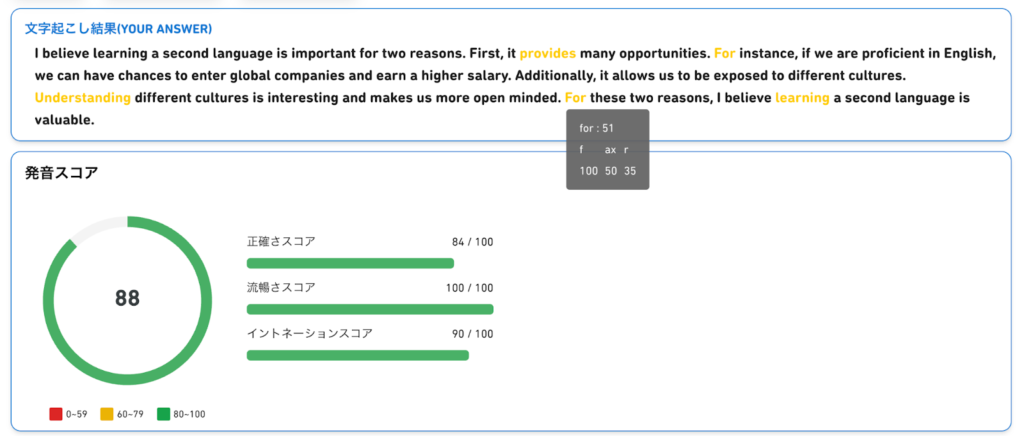 あなたが話した内容がそのまま 文字起こしされ、さらに 発音スコア を確認できるようになっています。