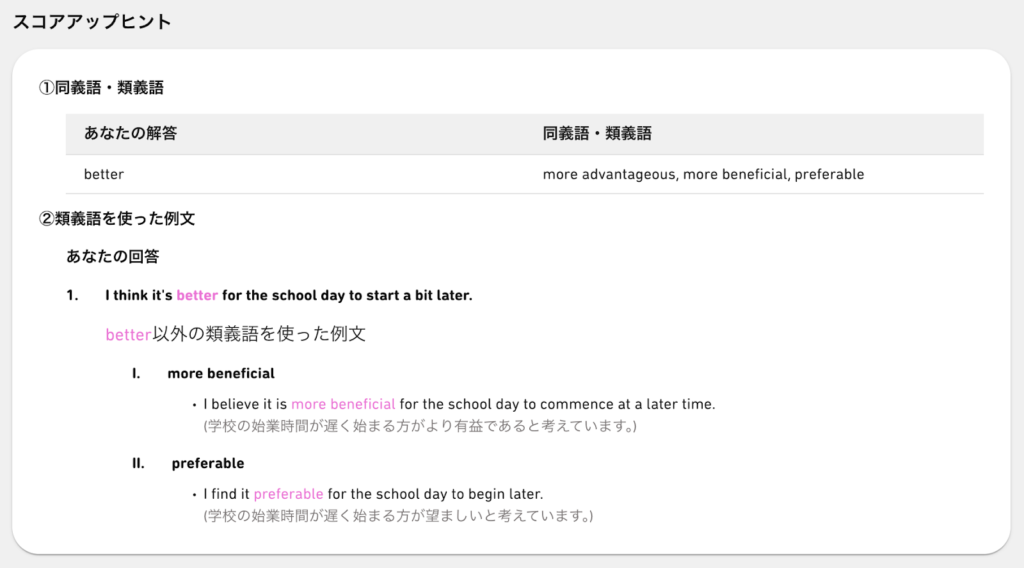 特に「スコアアップヒント」に表示される単語やフレーズは、他のパートでも共通して使えるため、習得すると総合スコアの底上げに直結します。