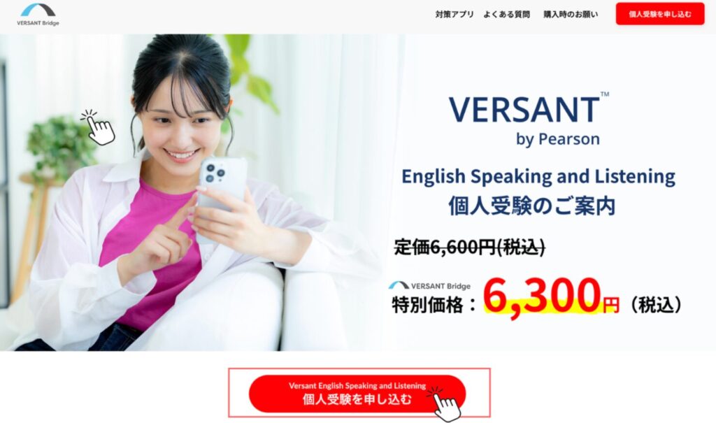 VERSANT Speaking & Listening Testの通常受験料は 6,600円(税込) ですが、VERSANT対策アプリ「VERSANT Bridge」利用者であれば、5%OFFの6,300円で受験可能です。