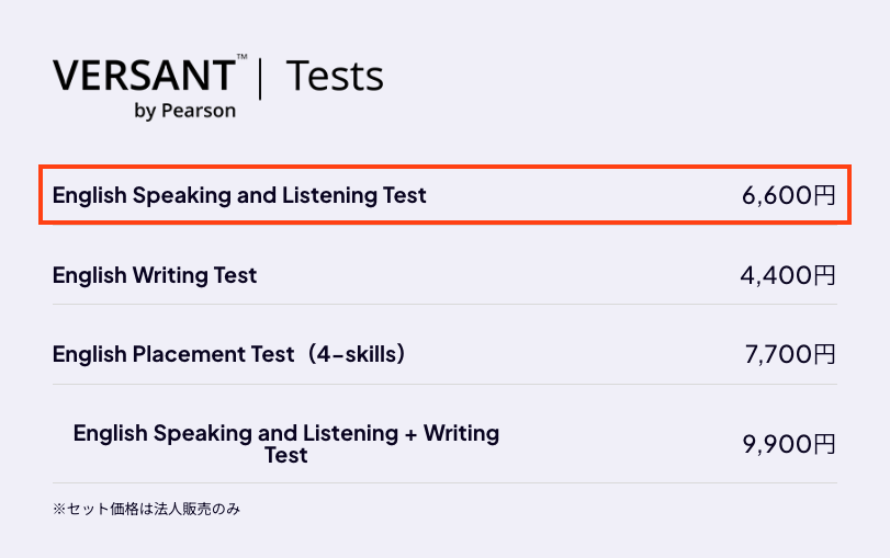VERSANT Speaking & Listening Testの通常料金は 6,600円(税込) です。