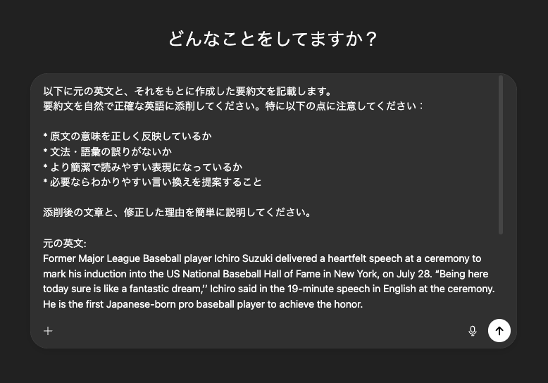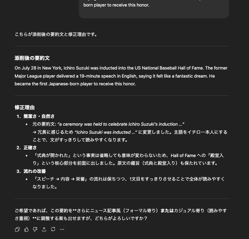 - 作成した要約文をChatGPTなどで添削し、表現の自然さや誤りなどをチェックする
