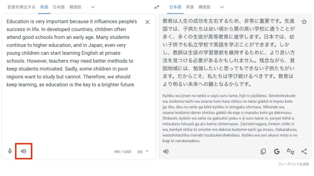 - Google翻訳を開き、練習したい英文をコピー&ペースト