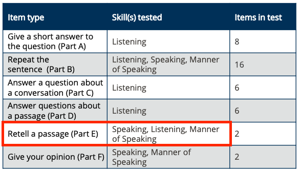 Part Eでは、Versantの評価スキル「リスニング」「スピーキング」「話法能力(言葉の使い方、話の内容)」の3つ全てが評価されます。