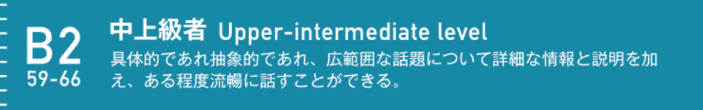 VERSANT 59点以上は、ビジネスの現場で十分に通用しやすい上級者層の目安です。Pearsonの資料では、59点はCEFR B2として示されています。