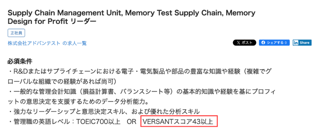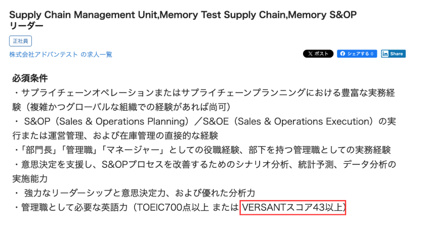 例えば、株式会社アドバンテストのS&OPリーダーでは、管理職として必要な英語力の目安として、VERSANT 43点以上と明記されています。
