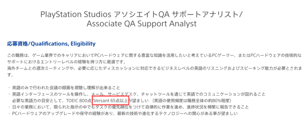 TOEICに比べると、VERSANTが仕事でどう評価されているのかはイメージしにくいかもしれません。しかし実際には、SMBCやアドバンテスト、PlayStation Studios、JBCCグループなどの求人でも、英語力の目安として記載されています。