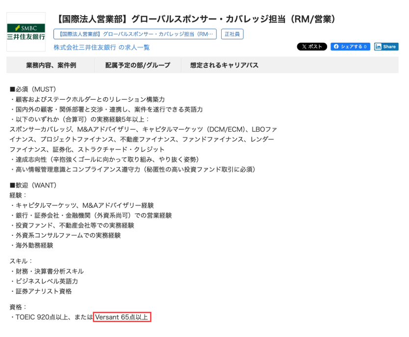例えば、三井住友銀行(SMBC)では、グローバルスポンサーを担当するカバレッジバンカーの募集で、歓迎要件としてVERSANT 65点以上が記載されています。