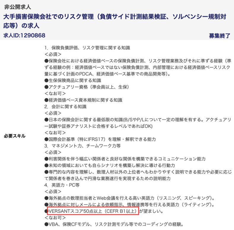 VERSANT 65点という高めの基準が置かれていることからも、高い実務英語力が期待されていることがわかります。